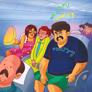 The traveler you can’t miss. Oversized backpack. Territorial energy. No self-awareness. The Boor talks at people, not with them, and one is enough to slow boarding, clog aisles, and turn travel chaos into open conflict.